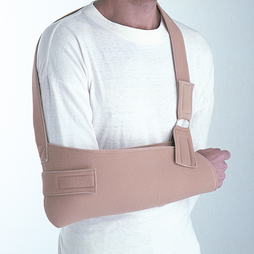 Cabestrillo de malla transpirable. Protección acolchada para liberar carga del hombro. Posibilidad de desabrochar el cabestrillo sin tener que levantar el brazo.